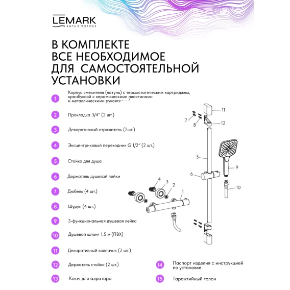 Металлическая розетка, Эксцентрики, Душевой шланг, Душевая лейка, Держатель для душевой лейки, Штанга душевая