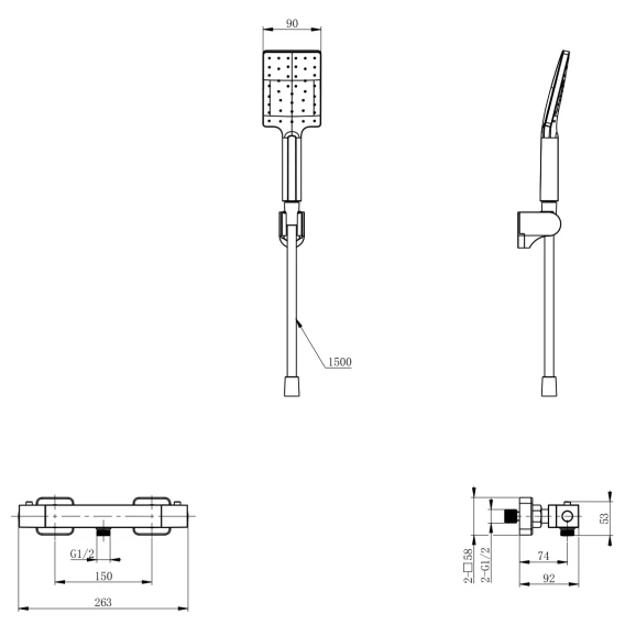Металлическая розетка, Эксцентрики, Душевой шланг, Душевая лейка, Держатель для душевой лейки