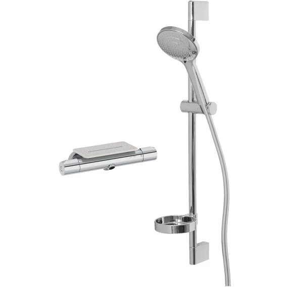 Крепление, Аэратор, Металлическая розетка, Эксцентрики, Душевой шланг, Душевая лейка, Держатель для душевой лейки, Полочка, Мыльница, Штанга душевая