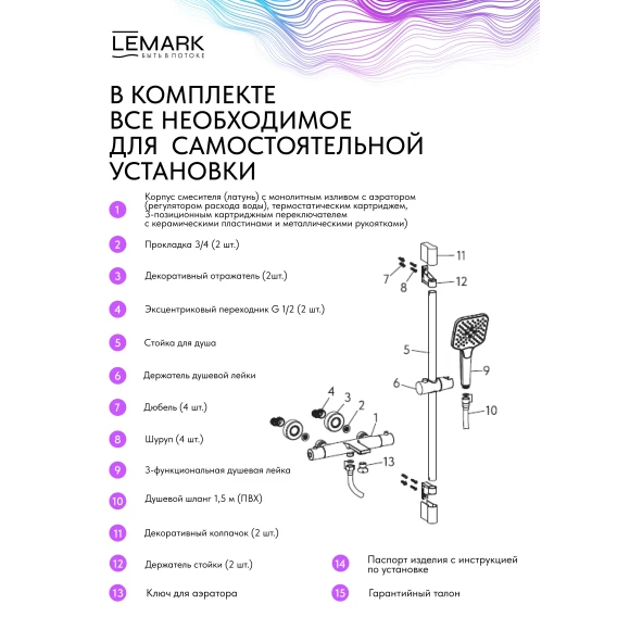 Аэратор, Металлическая розетка, Эксцентрики, Душевой шланг, Душевая лейка, Держатель для душевой лейки, Штанга душевая
