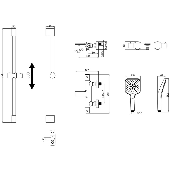 Аэратор, Металлическая розетка, Эксцентрики, Душевой шланг, Душевая лейка, Держатель для душевой лейки, Штанга душевая