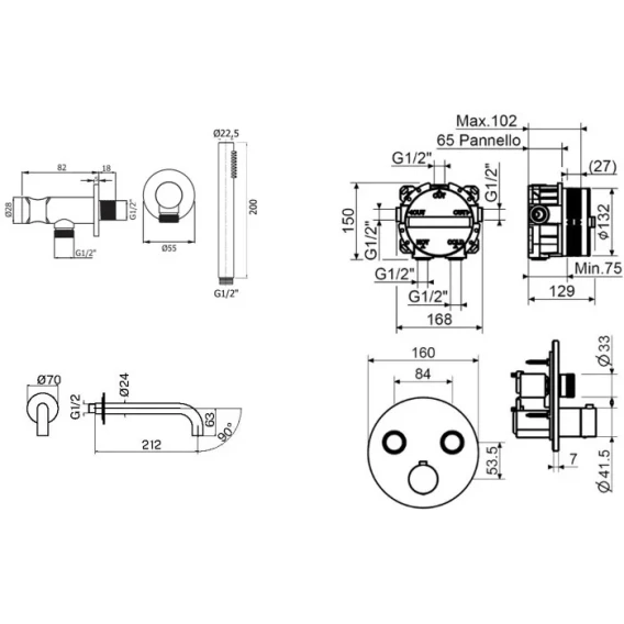 Аэратор, Душевой шланг, Душевая лейка, Подключение для душевого шланга с держателем, Излив, Скрытая монтажная часть