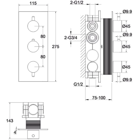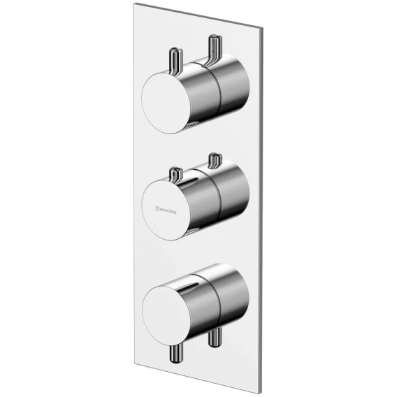 - размеры розетки: 115х275 мм;- минимальная глубина для установки: 75 мм;- два входа (для горячей и холодной воды): 3/4”;- три выхода смешанной воды: 1/2”;- корпус смесителя: латунь;- рукоятка смесителя: латунь;- термостатический картридж с ограничителем на 38°C: VERNET;- запорно-переключающий вентиль;- пропускная способность при давлении 3 Бар:1) поток №1 - 21 л/мин2) поток №2 - 21 л/мин3) поток №3 - 22 л/мин- встраиваемая часть в комплекте.