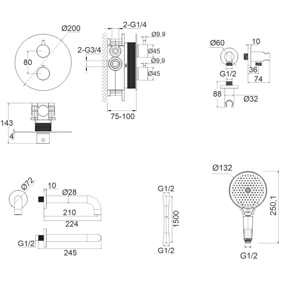 Аэратор, Душевой шланг, Душевая лейка, Подключение для душевого шланга с держателем, Излив, Скрытая монтажная часть