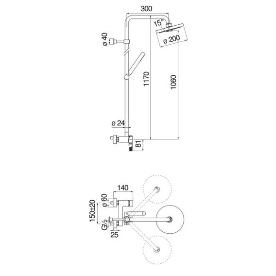 Металлическая розетка, Эксцентрики, Душевой шланг, Душевая лейка, Держатель для душевой лейки, Верхний душ, Смеситель, Кронштейн, Штанга душевая