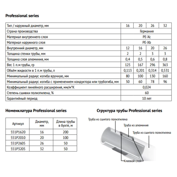 Металлопластиковая труба Professional series PEX-b/PEX-c Uni-Fitt 26х3 мм бухта 50 метров является высокопрочной, химически чистой трубой, предназначенной для транспортирования жидкостей, применяемых в системах отопления (радиаторных и поверхностных), водоснабжения и водоподготовки. Применяется труба Uni-Fitt в напольном и радиаторном отоплении, с питьевой и дождевой водой, для горячего и холодного водоснабжения, сжатого воздуха. Металлопластиковые трубы состоят из трех основных слоев: сшитый полиэтилен (внутренний слой, PEX-c) – алюминий – сшитый полиэтилен (внешний слой, PEX-b), соединенные между собой слоями высокопрочного клея. Наличие в структуре металлопластиковых труб алюминиевого антидиффузионного слоя, обеспечивающего кислородонепроницаемость и небольшое тепловое линейное расширение, делают трубы Uni-Fitt отличным решением для организации отопления.