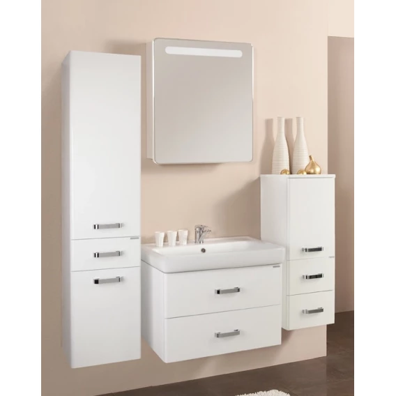 Стильная лаконичная модель, созданная для небольших ванных комнат. В тумбе имеются два ящика, изготовленные из декоративной влагостойкой ДСП. Верхний ящик имеет специальную организацию пространства, позволяющую хранить мелкие предметы, а нижний – широкий и вместительный для более крупных предметов.