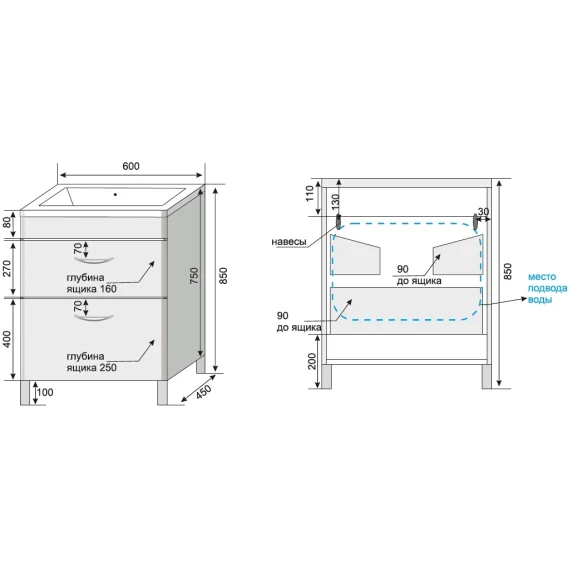 Тумба с раковиной белый глянец 60 см Style Line Каре СС-00002265 + СС-00002261
