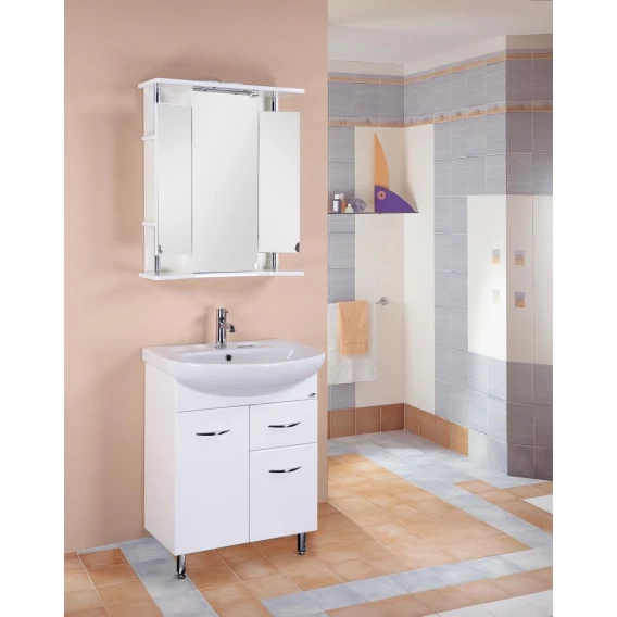 Тумба Onika Стелла 65 - достойный пример удобной мебели для небольшой ванной комнаты.Белая глянцевая поверхность, простые узкие ручки, отсутствие декора, лаконичная форма и минималистичный дизайн подойдет к любому интерьеру.В фасаде тумбы присутствует легкая асимметрия: слева расположена большая распашная дверца, за которой скрывается полка, а справа - выдвижной ящик, под ним - небольшая распашная дверца. Ящик тумбы оснащен направляющими полного выдвижения, а дверцы снабжены системой плавного закрывания.Корпус тумбы выполнен из ЛДСП, фасад - из ЛМДФ в пленке, устойчивых к механическим воздействиям, перепадам температур и высокой влажности.Три хромированных ручки и четыре ножки (2 декоративных хромированных и 2 пластиковых) идут в комплекте с тумбой.