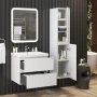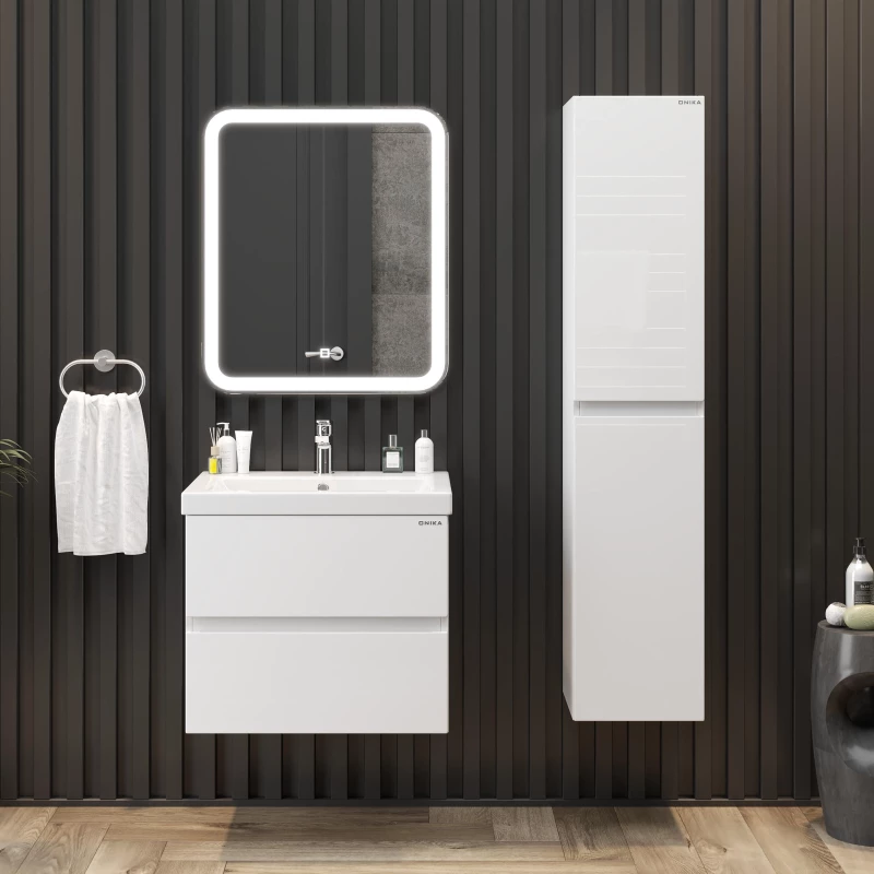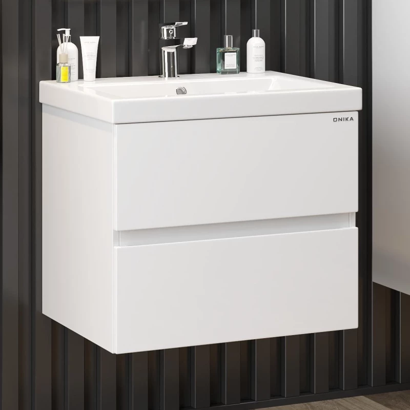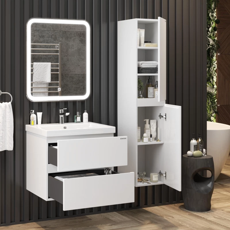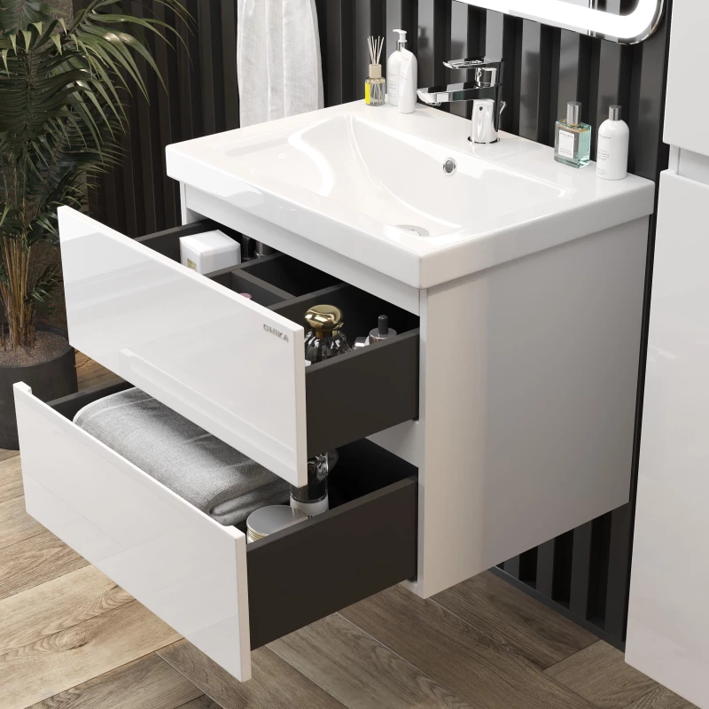Подвесная тумба для ванной комнаты Onika Эвада 70 сочетает в себе стильный минималистичный дизайн, белую глянцевую поверхность и высочайшее качество исполнения. Два вместительных ящика с направляющими скрытого монтажа с доводчиками помогут организовать пространство в ванной комнате и компактно разместить необходимые вещи.Подвесная конструкция значительно упрощает процесс уборки в ванной комнате, а ручки, изящно интегрированные в фасады, позволяют сделать эксплуатацию более удобной и практичной.Тумба выполнена из ЛМДФ и ЛДСП, покрытых эмалью, устойчивой к механическим воздействиям, перепадам температур и высокой влажности.Подвесы для крепления тумбы - в комплекте.