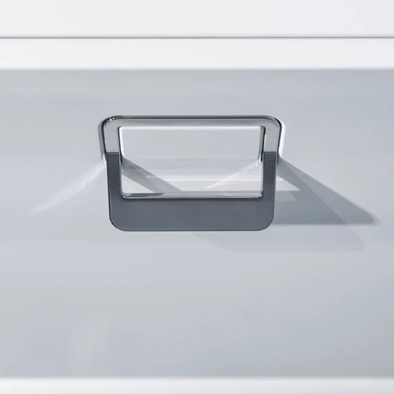 Тумба оснащена в стандартной комплектации ручками белого цвета, которые можно поменять на ручки в хромированном исполнении, приобретя их дополнительно.