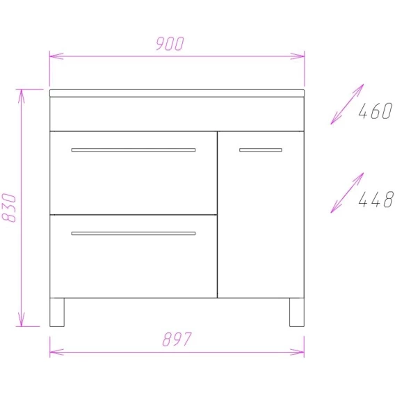 Стильная и практичная тумба Onika Олимп 90 отвечает всем современным требованиям функциональности.2 вместительных выдвижных ящика слева скроют от посторонних глаз все косметические и гигиенические средства, а пространство за распашной дверцей справа станет удобным местом для хранения различных бытовых принадлежностей.Оригинальные удлиненные матовые ручки на фасаде без декора придают комнате изящный вид.Ящики тумбы оснащены направляющими полного выдвижения, а дверца снабжена системой плавного закрывания.Корпус тумбы выполнен из ЛДСП, фасад - из ЛМДФ в пленке, устойчивых к механическим воздействиям, перепадам температур и высокой влажности.Три хромированных ручки и пять ножек (2 декоративных и 3 пластиковых) идут в комплекте с тумбой.