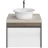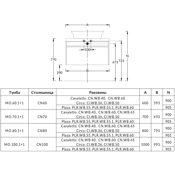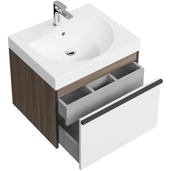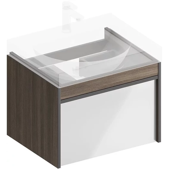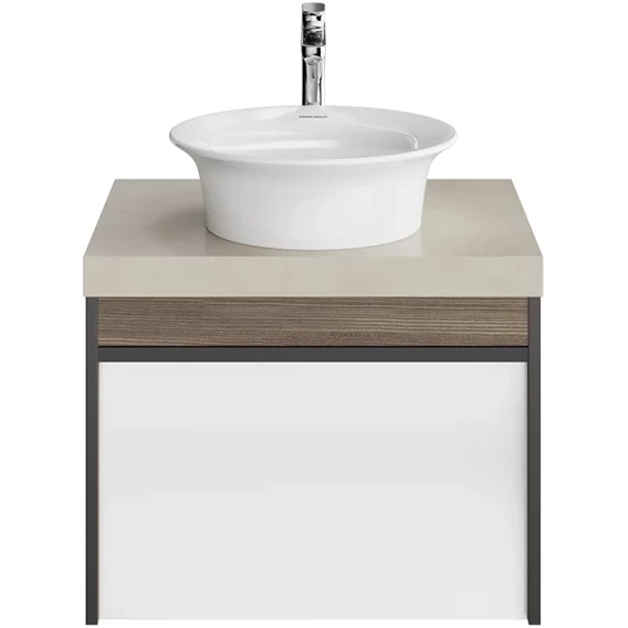 Мебель MODULA может быть использована для установки как мебельных раковин, так и любой из накладных, которые в этом случае устанавливаются на керамическую столешницу CANALETTO. Боковины тумбы решены в цвете «Арабика», фасад — белый глянцевый. Помимо основного вместительного ящика тумба оснащена внутренним ящиком-органайзером.