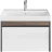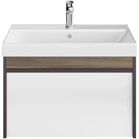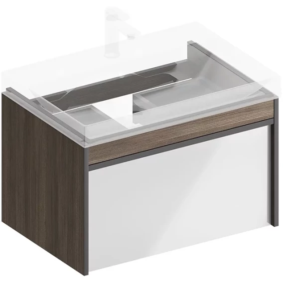 Мебель MODULA может быть использована для установки как мебельных раковин, так и любой из накладных, которые в этом случае устанавливаются на керамическую столешницу CANALETTO. Боковины тумбы решены в цвете «Арабика», фасад — белый глянцевый. Помимо основного вместительного ящика тумба оснащена внутренним ящиком-органайзером.