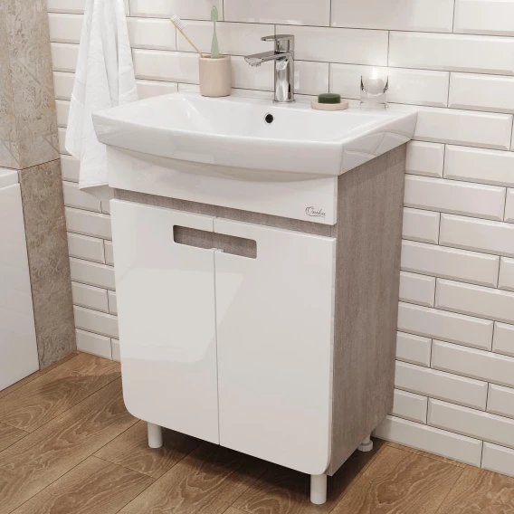Тумба Onika Харпер 50 поможет обустроить пространство ванной комнаты и привнесет в интерьер ощущение тепла и уюта. Уникальность тумбы в ее дизайне: корпус цвета бетона и фактурой мешковины отлично сочетается с белым глянцевым фасадом с закругленными углами.Ручки, изящно интегрированные в фасад, позволяют сделать эксплуатацию мебели более удобной и практичной.Одно большое отделение с полкой за двумя распашными дверцами, оснащенными системой плавного закрывания, позволит вместить все необходимые в ванной мелочи.Корпус тумбы выполнен из ЛДСП, фасад - из ЛМДФ в пленке, устойчивых к механическим воздействиям, перепадам температур и высокой влажности.2 декоративных и 1 пластиковая ножки с регулировкой по высоте идут в комплекте с тумбой.