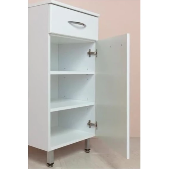 Напольный полупенал для ванной комнаты Onika КАПРИЗ 30, благодаря простому минималистичному дизайну, белой глянцевой поверхности, подойдет под любой интерьер ванной комнаты. Оптимальная высота пенала позволяет использовать его поверхность как дополнительную столешницу, небольшой удобный ящик с направляющими полного выдвижения подойдет для хранения мелких аксессуаров, а распашная дверца скрывает вместительное внутреннее пространство с двумя регулируемыми по высоте полочками, на которой можно компактно разместить бытовые принадлежности. Корпус пенала выполнен из ЛДСП, фасад - из МДФ в пленке, устойчивых к механическим воздействиям, перепадам температур и высокой влажности. 2 декоративных и 2 пластиковых ножки с регулировкой по высоте, а так же 2 хромированных ручки идут в комплекте с пеналом.