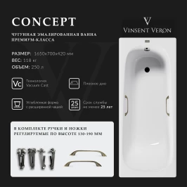 Ванна чугунная Vinsent Veron Concept VCO1657042H/VH0012BR 165x70 см, с ручками, белый