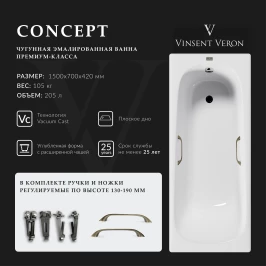 Ванна чугунная Vinsent Veron Concept VCO1507042H/VH0012BR 150x70 см, с ручками, белый