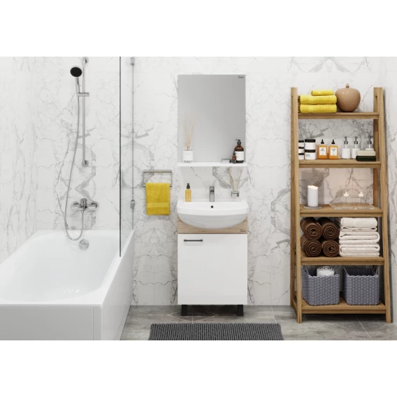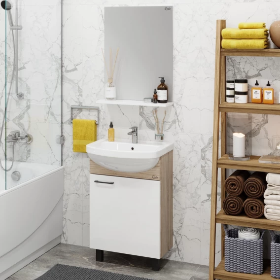 Напольная тумба для ванной комнаты Onika Эко 52 Black - это идеальное сочетание минимализма, функциональности и цены.Компактные габариты позволяют грамотно организовать небольшой санузел, а белый фасад и корпус цвета дуба гармонично сочетаются с черной фурнитурой и отлично впишутся в интерьер любой ванной комнаты.Распашная дверца скрывает вместительное пространство для хранения, разделенное полкой.Тумба выполнена из ЛДСП, устойчивой к механическим воздействиям, перепадам температур и высокой влажности.Хромированная ручка и три ножки (2 декоративных хромированных и 1 пластиковая) идут в комплекте с тумбой.