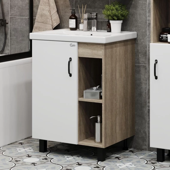 В тумбе Onika Тимбер 60 удачно сочетаются контрастные цвета и фактуры: белый матовый фасад с покрытием SoftTouch, корпус цвета дуба с роскошной текстурой, черная матовая металлическая фурнитура. Открытые полки справа обеспечивают быстрый доступ к часто используемым аксессуарам, а пространство за распашной дверцей слева, снабженной системой плавного закрывания, станет удобным местом для хранения различных бытовых принадлежностей.Корпус тумбы выполнен из ЛДСП, фасад - из ЛМДФ в пленке, устойчивых к механическим воздействиям, перепадам температур и высокой влажности.Черная металлическая ручка и 4 ножки (2 декоративных черных и 2 пластиковых) идут в комплекте с тумбой.