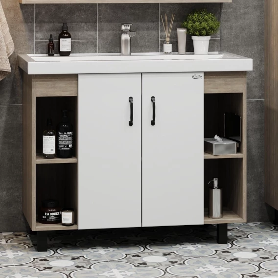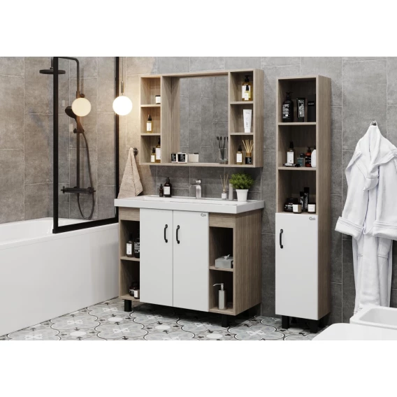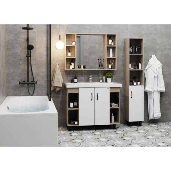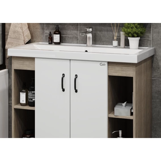 В тумбе Onika Тимбер 100 удачно сочетаются контрастные цвета и фактуры: белый матовый фасад с покрытием SoftTouch, корпус цвета дуба с роскошной текстурой, черная матовая металлическая фурнитура. Открытые полки по бокам от основного отделения обеспечивают быстрый доступ к часто используемым аксессуарам, а пространство за распашными дверцами с доводчиками по центру тумбы, станет удобным местом для хранения различных бытовых принадлежностей.Корпус тумбы выполнен из ЛДСП, фасад - из ЛМДФ в пленке, устойчивых к механическим воздействиям, перепадам температур и высокой влажности.2 черных металлических ручки и 4 ножки (2 декоративных черных и 2 пластиковых) идут в комплекте с тумбой.