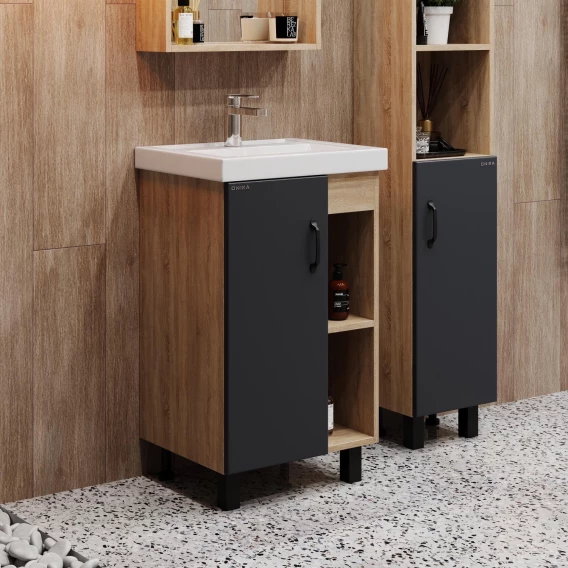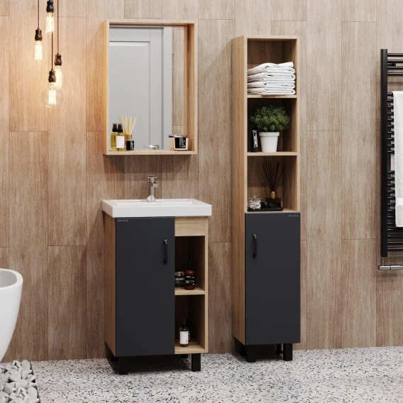 В тумбе Onika Тимбер 50 удачно сочетаются контрастные цвета и фактуры: серый матовый фасад с покрытием SoftTouch, корпус цвета дуба с роскошной текстурой, черная матовая металлическая фурнитура. Открытые полки справа обеспечивают быстрый доступ к часто используемым аксессуарам, а пространство за распашной дверцей слева, снабженной системой плавного закрывания, станет удобным местом для хранения различных бытовых принадлежностей.Корпус тумбы выполнен из ЛДСП, фасад - из ЛМДФ в пленке, устойчивых к механическим воздействиям, перепадам температур и высокой влажности.Черная металлическая ручка и 4 ножки (2 декоративных черных и 2 пластиковых) идут в комплекте с тумбой.