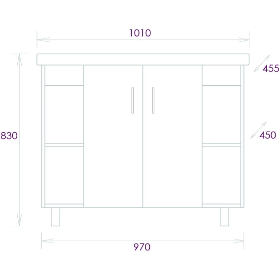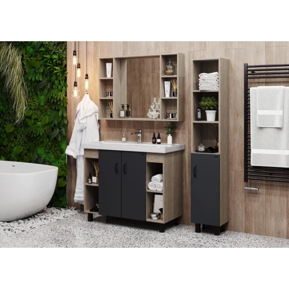 В тумбе Onika Тимбер 100 удачно сочетаются контрастные цвета и фактуры: серый матовый фасад с покрытием SoftTouch, корпус цвета дуба с роскошной текстурой, черная матовая металлическая фурнитура. Открытые полки по бокам от основного отделения обеспечивают быстрый доступ к часто используемым аксессуарам, а пространство за распашными дверцами с доводчиками по центру тумбы, станет удобным местом для хранения различных бытовых принадлежностей.Корпус тумбы выполнен из ЛДСП, фасад - из ЛМДФ в пленке, устойчивых к механическим воздействиям, перепадам температур и высокой влажности.2 черных металлических ручки и 4 ножки (2 декоративных черных и 2 пластиковых) идут в комплекте с тумбой.