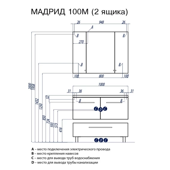 Тумба Мадрид 100 М 2 ящика чёрный глянец Акватон 1A128001MA950