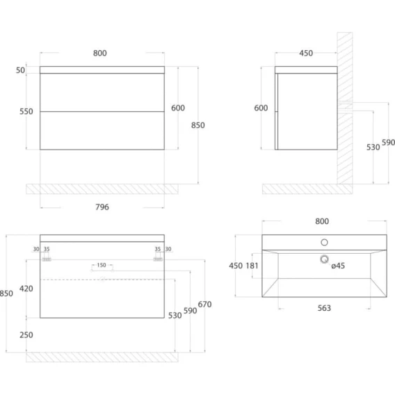 Тумба с раковиной Orange Line Li-60TuwMDF+B07-345W 60,2 см, подвесная, со столешницей, белый матовый