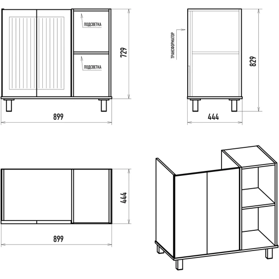 Крепление, Механизм доводчика, Полочка, Ручки, Подсветка, Ножки
