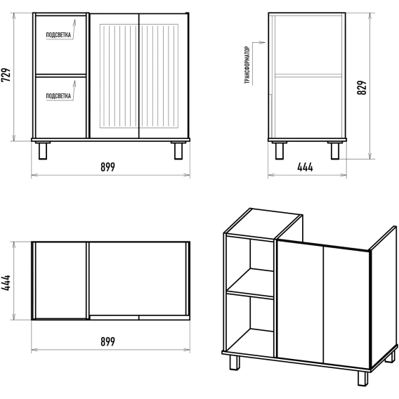 Крепление, Механизм доводчика, Полочка, Ручки, Подсветка, Ножки