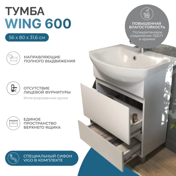 Тумба под раковину Vigo Wing tn.WIN.BAL.60.2Y белый 56 см, напольная, белый