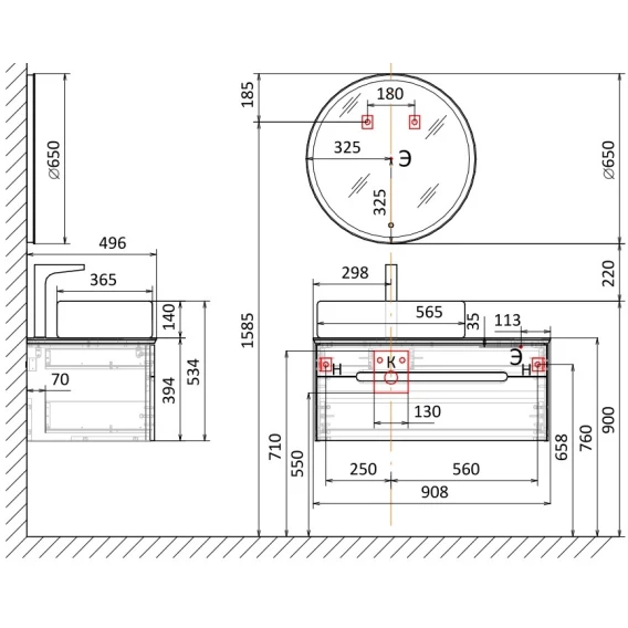 Механизм доводчика, Ящик, LED подсветка, Сенсорный выключатель, Столешница, Тумба под раковину, Раковина