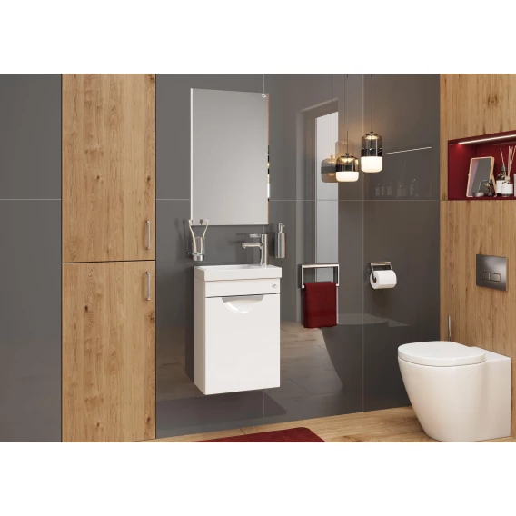 Подвесная тумба Onika Комо 40 - идеальное решение для ультракомпактных ванных комнат.Главные особенности - это белая глянцевая поверхность, миниатюрные габариты, удобная врезная хромированная ручка на дверце с системой плавного закрывания, за которой есть место для размещения необходимых мелочей.Тумба надежно крепится к стене и не занимает место на полу, не создавая при этом сложностей в уборке помещения.Тумба выполнена из надежной ЛЛМДФ в пленке, устойчивой к механическим воздействиям, перепадам температур и высокой влажности.Подвесы для крепления тумбы - в комплекте.
