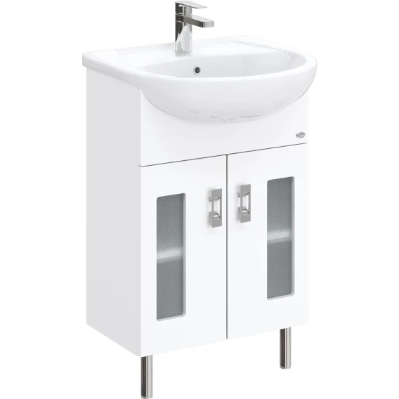 Стильная и красивая напольная тумба Onika Кристалл 55 сможет гармонично вписаться в любой интерьер.Белоснежный глянцевый цвет фасада в сочетании со вставками из матового стекла и хромированными ручками необычной формы придадут ванной комнате ощущение свежести, чистоты и уюта.За распашными дверцами, снабженными системой плавного закрывания и украшенными хромированными ручками, скрывается просторное внутреннее пространство, разделенное горизонтальной полкой: оно служит для размещения необходимых бытовых принадлежностей.Корпус тумбы выполнен из ЛДСП, фасад - из ЛМДФ в пленке, устойчивых к механическим воздействиям, перепадам температур и высокой влажности.Две хромированных ручки и три ножки (2 декоративных хромированных и 1 пластиковая) идут в комплекте с тумбой.
