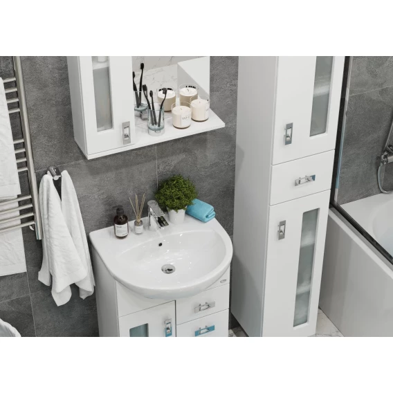 Стильная и красивая напольная тумба Onika Кристалл 55 сможет гармонично вписаться в любой интерьер.Белоснежный глянцевый цвет фасада в сочетании со вставками из матового стекла и хромированными ручками необычной формы придадут ванной комнате ощущение свежести, чистоты и уюта.В фасаде тумбы присутствует легкая асимметрия: слева расположена большая распашная дверца со вставкой из матового стекла, за которой скрывается полка, а справа - выкатной ящик, под ним - небольшая распашная дверца. Ящик тумбы оснащен направляющими полного выдвижения, а дверцы снабжены системой плавного закрывания.Корпус тумбы выполнен из ЛДСП, фасад - из ЛМДФ в пленке, устойчивых к механическим воздействиям, перепадам температур и высокой влажности.Три хромированных ручки и три ножки (2 декоративных хромированных и 1 пластиковая) идут в комплекте с тумбой.