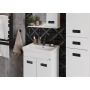 Напольная тумба для ванной комнаты Onika Балтика-Квадро Black 55 - это простые функциональные формы и яркий акцент в любом дизайне.Глянцевый белый цвет фасада контрастирует с черной матовой фурнитурой, а ненавязчивая горизонтальная фрезеровка дополняет образ стильной и современной мебели.За распашными дверцами с системой плавного закрывания расположено вместительное отделение, разделенное на две части горизонтальной полочкой, которое станет удобным местом для хранения различных бытовых принадлежностей.Корпус тумбы выполнен из ЛДСП, фасад - из ЛМДФ в пленке, устойчивых к механическим воздействиям, перепадам температур и высокой влажности.Ручки врезаны в фасады. Ножки (2 декоративных и 1 пластиковая) с регулировкой по высоте идут в комплекте с тумбой.