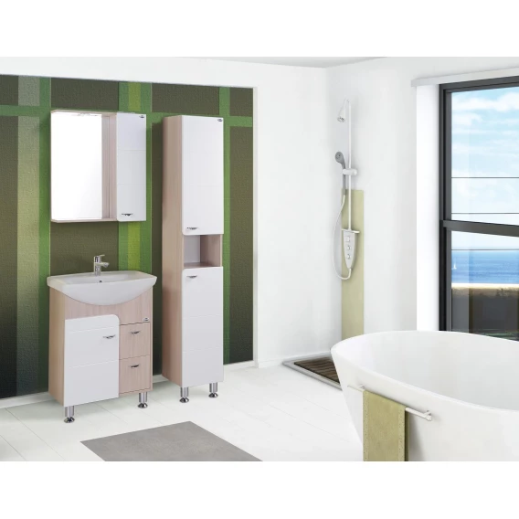 В оригинальной напольной тумбе Onika Стиль 60 удачно сочетаются контрастные цвета и фактуры: белый глянец на фоне светлого натурального дерева очень эффектно смотрится практически в любых интерьерах ванной комнаты.Два выдвижных ящика справа и большая ниша с распашной дверцей слева - отличное место для хранения необходимых в ванной комнате вещей.Ящики тумбы оснащены направляющими полного выдвижения, а дверца снабжена системой плавного закрывания.Корпус тумбы выполнен из ЛДСП, фасад - из ЛМДФ в пленке, устойчивых к механическим воздействиям, перепадам температур и высокой влажности.Три хромированных ручки и четыре ножки (2 декоративных хромированных и 2 пластиковых) идут в комплекте с тумбой.