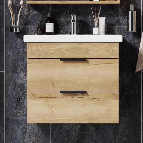 Подвесная тумба для ванной комнаты Onika Легран 60 - это сочетание насыщенного древесного декора и благородства металла: роскошная текстура и натуральный цвет дуба дают теплоту, а матовые металлические ручки добавляют урбанизма и солидности.Два ящика тумбы плавно открываются и закрываются благодаря направляющим полного выдвижения с доводчиками. Нижний ящик предназначен для больших предметов, а верхний, имеющий удобную систему организации пространства, - для мелких аксессуаров. Тумба выполнена из ЛДСП, устойчивой к механическим воздействиям, перепадам температур и высокой влажности, при этом она надежно крепится к стене и не занимает место на полу, не создавая при этом сложностей в уборке помещения.Ручки и подвесы для крепления тумбы - в комплекте.