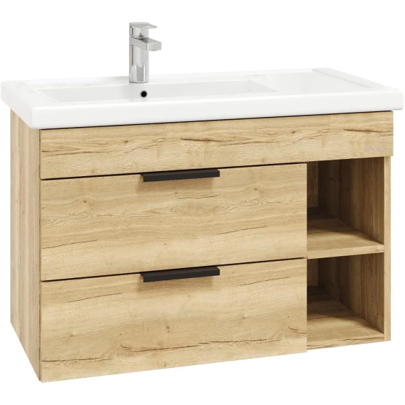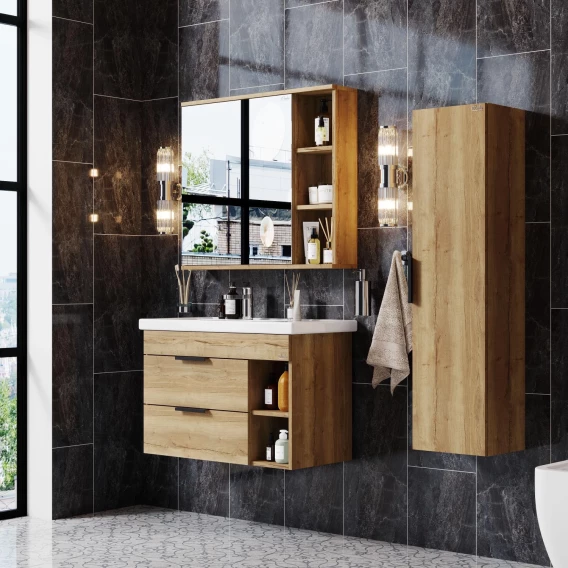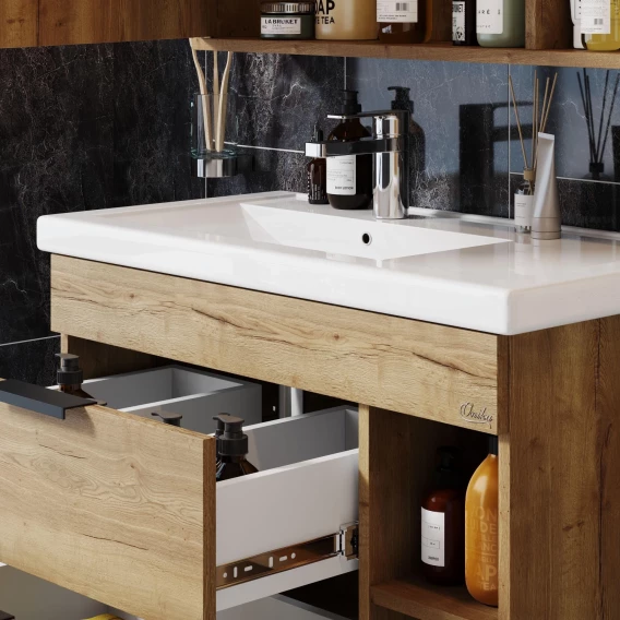 Подвесная тумба для ванной комнаты Onika Легран 80 - это сочетание насыщенного древесного декора и благородства металла: роскошная текстура и натуральный цвет дуба дают теплоту, а матовые металлические ручки добавляют урбанизма и солидности.Тумба имеет два ящика, снабженные системой плавного закрывания. Нижний предназначен для больших предметов, а верхний, имеющий удобную систему организации пространства, - для мелких аксессуаров. Две открытые полки справа от ящиков служат дополнительным пространством для хранения.Тумба выполнена из ЛДСП, устойчивой к механическим воздействиям, перепадам температур и высокой влажности, при этом она надежно крепится к стене и не занимает место на полу, не создавая при этом сложностей в уборке помещения.Ручки и подвесы для крепления тумбы - в комплекте.