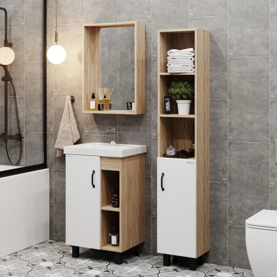 В тумбе Onika Тимбер 50 удачно сочетаются контрастные цвета и фактуры: белый матовый фасад с покрытием SoftTouch, корпус цвета дуба с роскошной текстурой, черная матовая металлическая фурнитура. Открытые полки справа обеспечивают быстрый доступ к часто используемым аксессуарам, а пространство за распашной дверцей слева, снабженной системой плавного закрывания, станет удобным местом для хранения различных бытовых принадлежностей.Корпус тумбы выполнен из ЛДСП, фасад - из ЛМДФ в пленке, устойчивых к механическим воздействиям, перепадам температур и высокой влажности.Черная металлическая ручка и 4 ножки (2 черных и 2 пластиковых) идут в комплекте с тумбой.