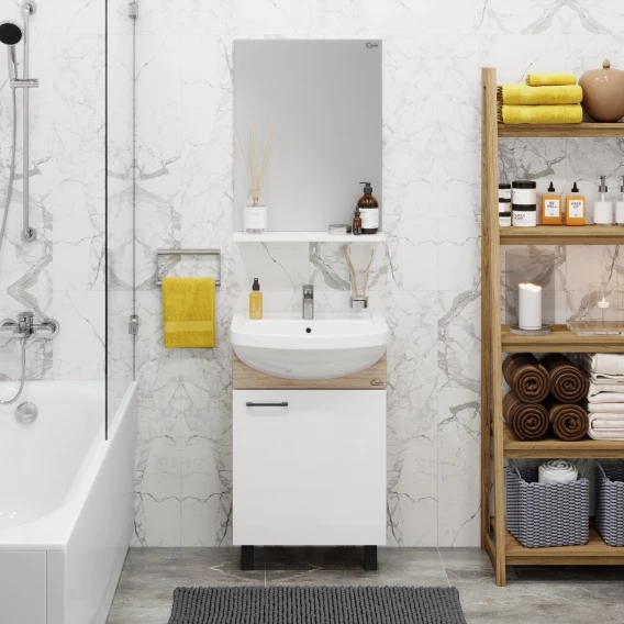 Напольная тума для ванной комнаты Onika Эко 52 Black - это идеальное сочетание минимализма, функциональности и цены.Компактные габариты позволяют грамотно организовать небольшой санузел, а белый фасад и корпус цвета дуба гармонично сочетаются с черной фурнитурой и отлично впишутся в интерьер любой ванной комнаты.Распашная дверца скрывает вместительное пространство для хранения, разделенное полкой.Тумба выполнена из ЛДСП, устойчивой к механическим воздействиям, перепадам температур и высокой влажности.Хромированная ручка и три ножки (2 декоративных хромированных и 1 пластиковая) идут в комплекте с тумбой.Уникальная разборная конструкция не доставит хлопот при перевозке.