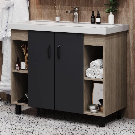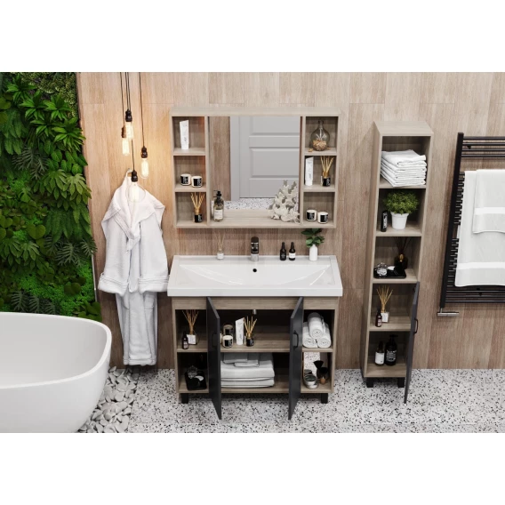 В тумбе Onika Тимбер 100 удачно сочетаются контрастные цвета и фактуры: серый матовый фасад с покрытием SoftTouch, корпус цвета дуба с роскошной текстурой, черная матовая металлическая фурнитура. Открытые полки по бокам от основного отделения обеспечивают быстрый доступ к часто используемым аксессуарам, а пространство за распашными дверцами с доводчиками по центру тумбы, станет удобным местом для хранения различных бытовых принадлежностей.Корпус тумбы выполнен из ЛДСП, фасад - из ЛМДФ в пленке, устойчивых к механическим воздействиям, перепадам температур и высокой влажности.2 черных металлических ручки и 4 ножки (2 декоративных черных и 2 пластиковых) идут в комплекте с тумбой.