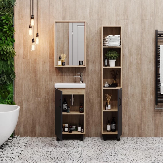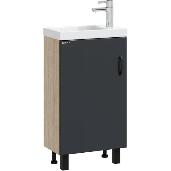 В тумбе Onika Тимбер 45 удачно сочетаются контрастные цвета и фактуры: серый матовый фасад с покрытием SoftTouch, корпус цвета дуба с роскошной текстурой, черная матовая металлическая фурнитура. Пространство за распашной дверцей, снабженной системой плавного закрывания, станет удобным местом для хранения различных бытовых принадлежностей.Корпус тумбы выполнен из ЛДСП, фасад - из ЛМДФ в пленке, устойчивых к механическим воздействиям, перепадам температур и высокой влажности.Черная металлическая ручка и 4 ножки (2 декоративных черных и 2 пластиковых) идут в комплекте с тумбой.