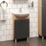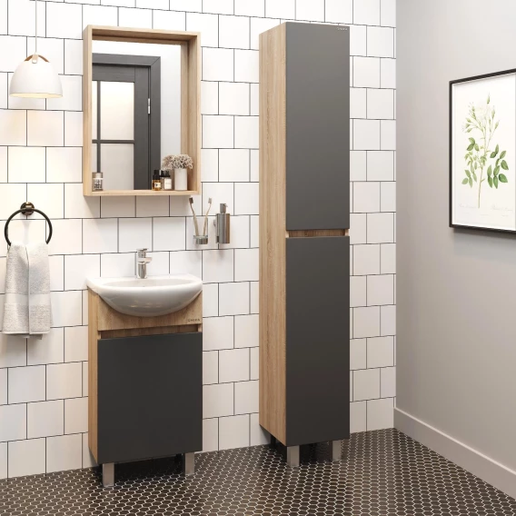 Напольная тумба для ванной комнаты Onika Милтон 45 - идеальное решение для небольшого санузла.Тумба сочетает в себе красоту и функциональность: серый матовый фасад с покрытием SoftTouch, корпус цвета дуб сонома с роскошной текстурой, строгие формы без декора. За дверцей с интегрированной ручкой скрывается пространство с полкой для размещения необходимых бытовых принадлежностей. Корпус тумбы выполнен из ЛДСП, фасад - из ЛМДФ в пленке, специально предназначенных для использования в условиях высокой влажности. Ножки (2 декоративных хромированных и 1 пластиковая) идут в комплекте с тумбой.