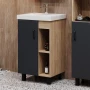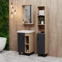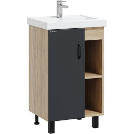 В тумбе Onika Тимбер 50 удачно сочетаются контрастные цвета и фактуры: серый матовый фасад с покрытием SoftTouch, корпус цвета дуба с роскошной текстурой, черная матовая металлическая фурнитура. Открытые полки справа обеспечивают быстрый доступ к часто используемым аксессуарам, а пространство за распашной дверцей слева, снабженной системой плавного закрывания, станет удобным местом для хранения различных бытовых принадлежностей.Корпус тумбы выполнен из ЛДСП, фасад - из ЛМДФ в пленке, устойчивых к механическим воздействиям, перепадам температур и высокой влажности.Черная металлическая ручка и 4 ножки (2 декоративных черных и 2 пластиковых) идут в комплекте с тумбой.