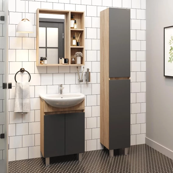 Напольная тумба для ванной комнаты Onika Милтон 60 - идеальное решение для небольшого санузла.Тумба сочетает в себе красоту и функциональность: серый матовый фасад с покрытием SoftTouch, корпус цвета дуб сонома с роскошной текстурой, строгие формы без декора. За дверцей с интегрированной ручкой скрывается пространство с полкой для размещения необходимых бытовых принадлежностей. Корпус тумбы выполнен из ЛДСП, фасад - из ЛМДФ в пленке, специально предназначенных для использования в условиях высокой влажности. Ножки (2 декоративных хромированных и 1 пластиковая) идут в комплекте с тумбой.