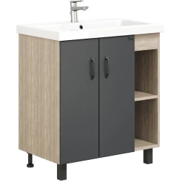 В тумбе Onika Тимбер 80 удачно сочетаются контрастные цвета и фактуры: серый матовый фасад с покрытием SoftTouch, корпус цвета дуба с роскошной текстурой, черная матовая металлическая фурнитура. Открытые полки справа обеспечивают быстрый доступ к часто используемым аксессуарам, а пространство за распашными дверцами слева, снабженными системой плавного закрывания, станет удобным местом для хранения различных бытовых принадлежностей.Корпус тумбы выполнен из ЛДСП, фасад - из ЛМДФ в пленке, устойчивых к механическим воздействиям, перепадам температур и высокой влажности.2 черных металлических ручки и 4 ножки (2 декоративных черных и 2 пластиковых) идут в комплекте с тумбой.