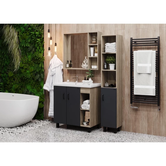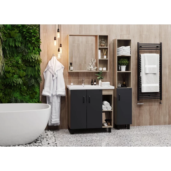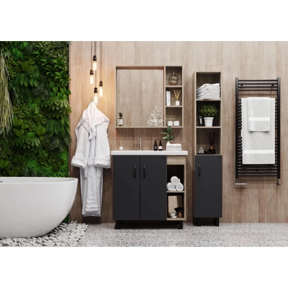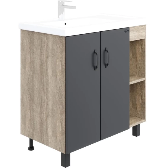 В тумбе Onika Тимбер 80 удачно сочетаются контрастные цвета и фактуры: серый матовый фасад с покрытием SoftTouch, корпус цвета дуба с роскошной текстурой, черная матовая металлическая фурнитура. Открытые полки справа обеспечивают быстрый доступ к часто используемым аксессуарам, а пространство за распашными дверцами слева, снабженными системой плавного закрывания, станет удобным местом для хранения различных бытовых принадлежностей.Корпус тумбы выполнен из ЛДСП, фасад - из ЛМДФ в пленке, устойчивых к механическим воздействиям, перепадам температур и высокой влажности.2 черных металлических ручки и 4 ножки (2 декоративных черных и 2 пластиковых) идут в комплекте с тумбой.