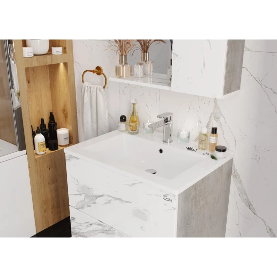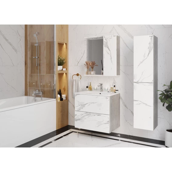 Подвесная тумба Onika Марбл 75 станет стильным и функциональным элементом пространства современной ванной комнаты. Спроектированная дизайнерами в минималистичном облике, тумба отражает самые актуальные расцветки сезона - бетон и мрамор.Пространство за 2-ми распашными дверцами, снабженными системой плавного закрывания, станет удобным местом для хранения необходимых в ванной комнате вещей.Белые матовые ручки практически не заметны на фасаде и не отвлекают взгляд от текстуры мрамора.Корпус тумбы выполнен из ЛДСП, фасады ящиков - из ЛМДФ в пленке, устойчивых к механическим воздействиям, перепадам температур и высокой влажности.Тумба надежно крепится к стене и не занимает место на полу, не создавая при этом сложностей в уборке помещения.Подвесы для крепления тумбы и 4 белые матовые ручки - в комплекте.